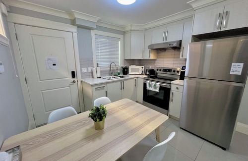 Spectacular fully furnished 2-bedroom private basement suite, centrally located in a quiet, convenient and safe residential neighborhood. This bright, newly built modern suite is equipped with Hornbill smart lock at its own private entrance. Features include a sleek, all white galley kitchen with Samsung appliances, in-suite Blomberg washer/dryer, 40” Smart TV, and brand new modern furniture. Free street parking available. Steps away from Main Street and Marine Gateway shopping mall and movie theatre. 10 mins drive from YVR airport and 15 mins drive to Downtown or Burnaby.
