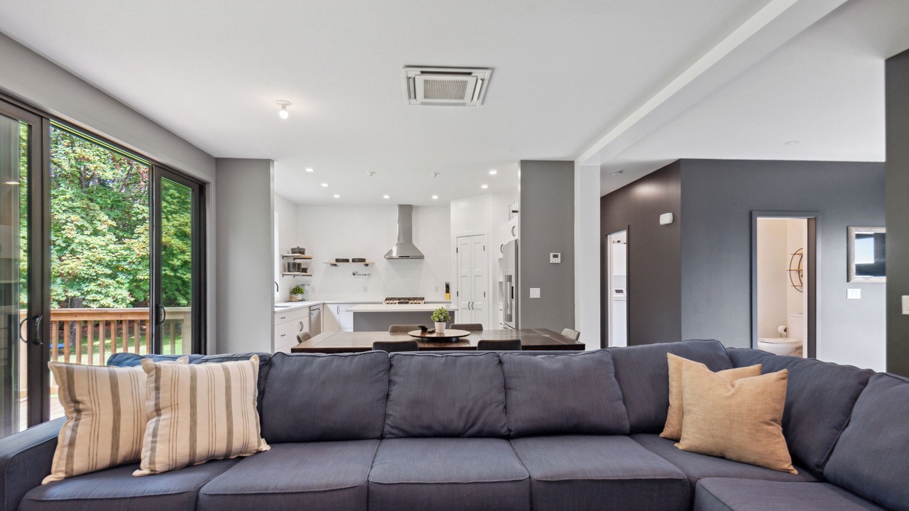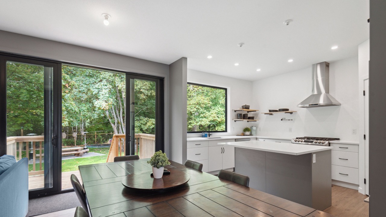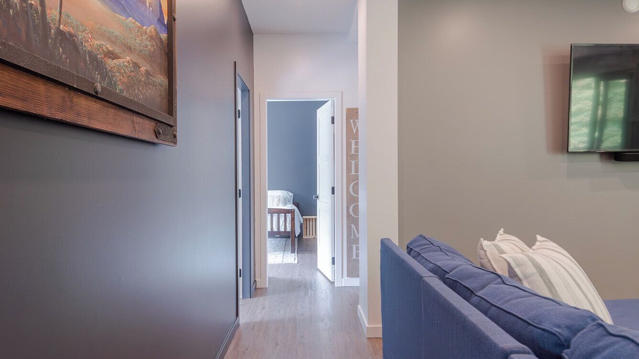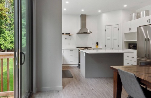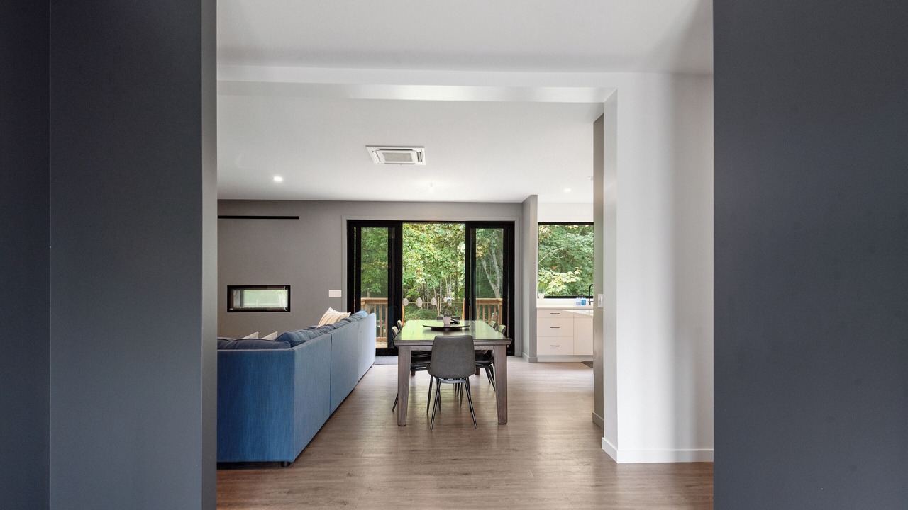 The River House is a stylish and comfortable simple layout that sleeps 8 guests in 4 bedrooms. We have the primary bedroom with a king sized bed and views of the backyard. The primary bedroom also has a full sized ensuite bathroom. We have two bedrooms each with their own tv and a queen bed. The fourth bedroom has two singles and a tv. There is a powder room in the entrance and another full bathroom down the hall. The fully loaded kitchen looks out over the backyard and is equipped with everything that you need to create a home cooked meal.