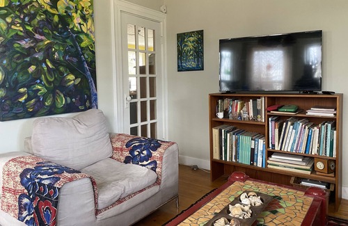The house features 3 comfortable bedrooms, a sitting room with a smart tv, a dining room, a gorgeous fully equipped kitchen with a propane stove and convection oven, and even an art studio/workshop space at the back end of the house for rainy day crafters or serious artists.