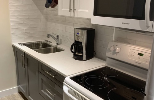 The main/master bedroom has a queen-sized bed comfortable for sleeping 2 people.Living room has couch with double memory foam pull out bed. The bedroom also has a large built in closet with plenty of space! The cozy open concept, clean and bright living room is furnished with leather sofa and another full size sofa(hide a bed) The quaint kitchen is perfect for dining as it is equipped with all appliances needed for your stay .
