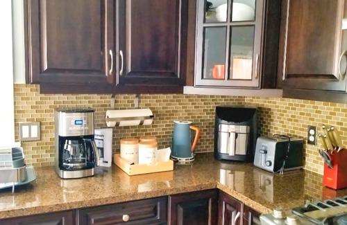 The kitchen is fully equipped with all cooking supplies as well as dishes , condiments, a dishwasher, full oven, fridge, stick blender, and other small appliances. There is beautiful island bar in the middle with stool as well as a great dinning table right beside a gas fireplace. There is a bathroom right beside the kitchen for your convenience.