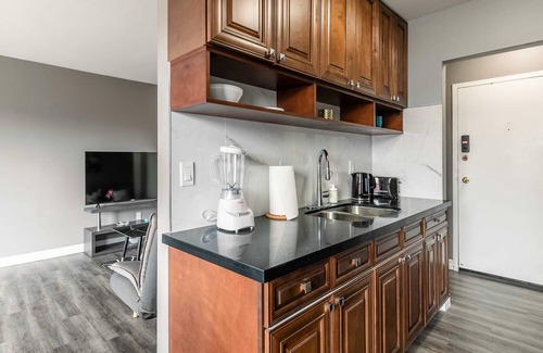 This 2-bedroom unit has beautiful hardwood floors and an open concept living space. The first bedroom features a Queen sized bed with comfortable linens and lots of natural light. The second has a King sized bed, large closet and bright sunny window. The living room has a comfortable sofa bed, and a smart TV with Netflix and high speed internet connection.