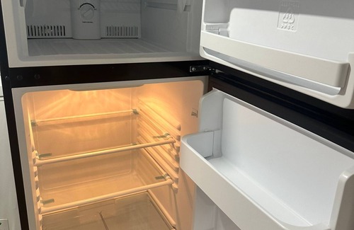 Full-size fridge, sink, toaster, kettle, pots, pans, utensils, dishware & wine glasses