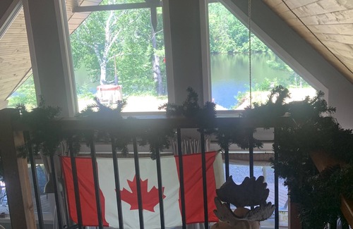 Enjoy stunning & copious views from our generous chalet windows. Plenty of free parking space, private lane, forested front with professionally landscaped unique rock waterfront. A grassy grotto type waterfront landing unique to the area!