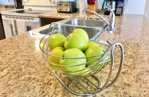 Fully Equipped Kitchen: Modern kitchen complete with all major appliances, a peninsula island with bar stools, and dining options including a six-person dining table, a four-person breakfast nook, and an outdoor patio table.