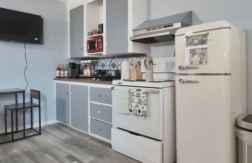 🍳 Compact kitchen with stove, fridge, cookware & dishes