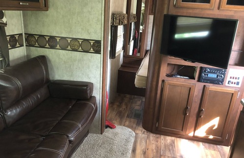 Now with wifi! Located only a short, 5 minute walk to St. Malo Beach, this location offers quick access to endless activities. Fully serviced with water, sewer and electricity hookup. The camper can comfortably sleep 10 guests. 2 sets of twin bunk beds is great for kids! The dining table turns into a double bed. The leather love seat turns into a bed that could sleep 1-2 smaller children. A picnic table, bbq, fire pit with grill and an outdoor kitchen complete the space.