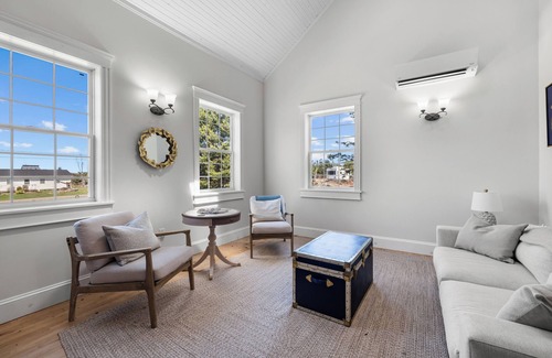 Upstairs, the second level offers two additional queen bedrooms, another full bathroom with tub/shower combo, and a sweet little bunk room just for kids. On the third floor, a bright and airy sitting room offers panoramic views of the dunes and ocean — the ideal place to enjoy a glass of wine or morning coffee. This room also includes a pull-out sofa for extra guests.