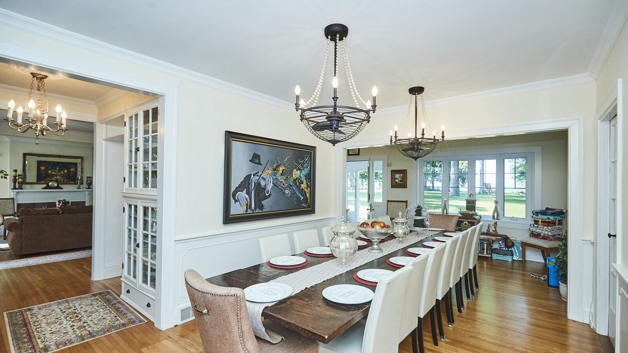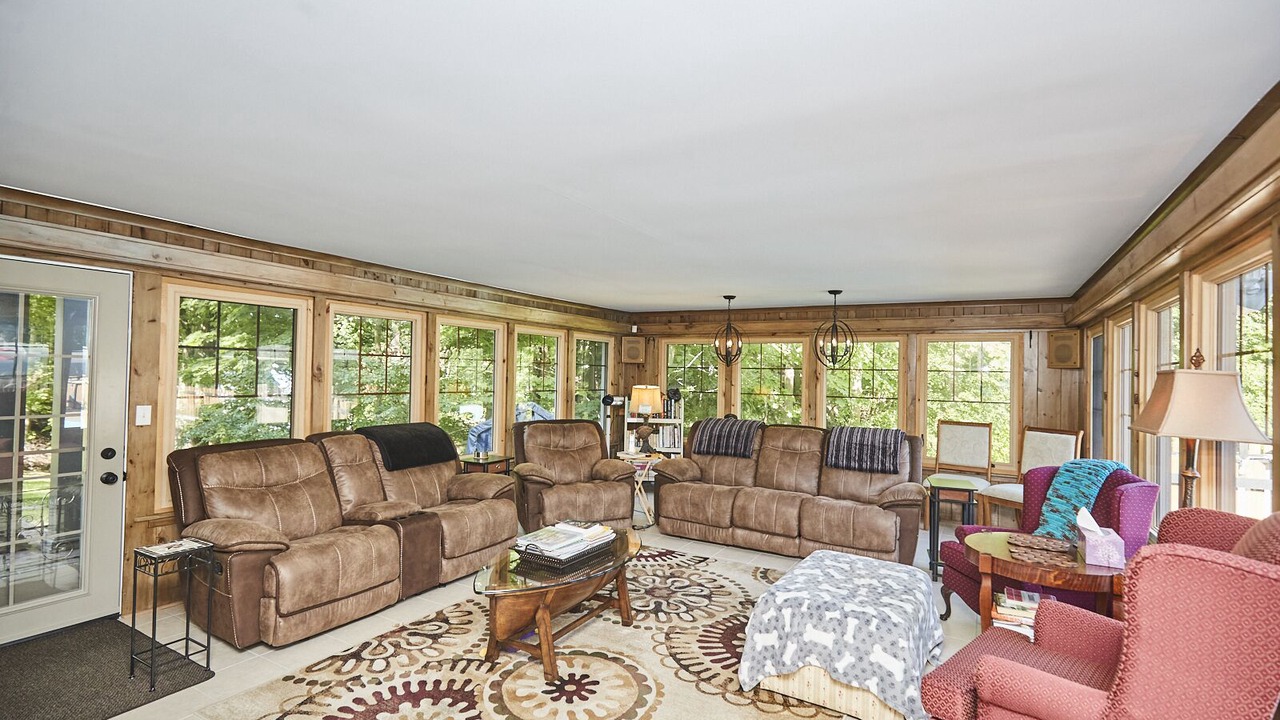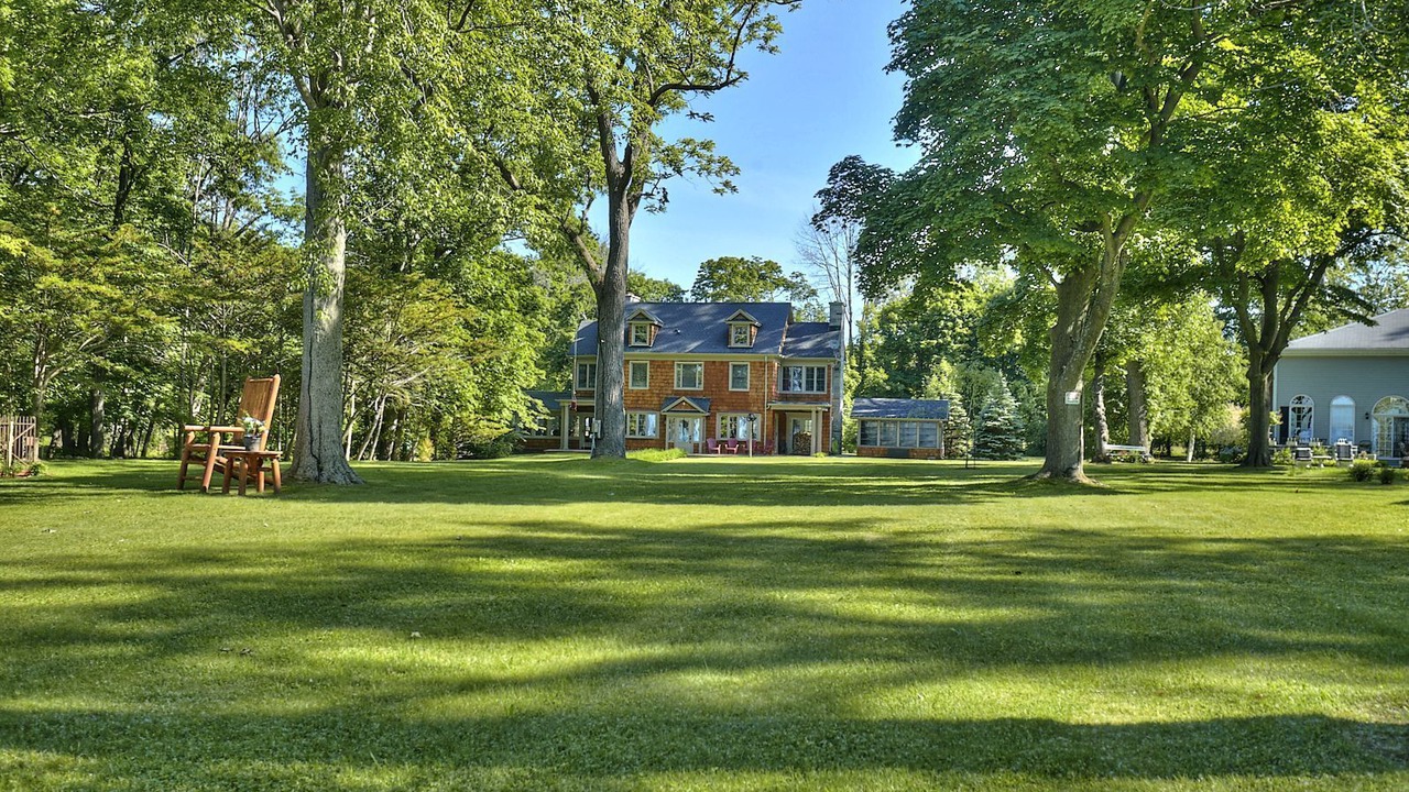 This 2 acre treed property features a 3800 sq ft home with gorgeous lakefront views. There is a large heated in-ground pool with lots of deck space and ample seating. In the pool area there is an outdoor kitchen and dining area. Overlooking the lake there is a screened in outdoor room with comfortable seating. A wagon, bikes, lawn games and beach toys are provided.