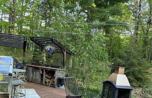A cozy log cabin with high end finishings in the midst of the Frontenac forest. Escape the city and restore your sense of nature while soaking in the hot tub by the fire pit or snuggle with the worlds friendliest dog on a screen porch under the stars of a dark sky preserve. Cuddle up by the wood stove with a purring cat in your lap after a hike along the Trans Canada trail.