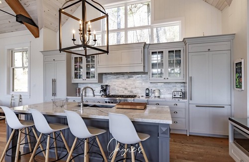 Large open-concept Great Room includes two spectacular views - the wall of windows overlooking the lake for daytime viewing, and the very large natural stone wood-burning fireplace for the evening. With 2 sitting areas, TV, dining table for 12 and beautiful chef's kitchen with Themador appliances and 4 bar stools, this cottage is a masterpiece for a fortunate family! Heated, reclaimed hemlock floors throughout the cottage help absorb the sound, and warm your feet in the few chilly days of the summer. The lower level has an entertainment room with 2 twin size bed-benches and ping pong table with walkout to front. With a recently installed heated floor, the lower level is home to the exercise room, which is equipped with a Bosu ball and range of bands. Framed posters line the walls of the workout room, with pictures of a scalable circuit workout for any level. All of the workouts use simple equipment and your own body weight, and it covers a full range of muscles. The exercise room also contains a double futon bed for extra overflow sleeping. The deck off the Great Room has dining table for 10 with a matching umbrella and additional sitting with outdoor patio furniture. The Control 4 Sound and Light system controls the outdoor lighting and speakers all over the cottage and deck with ability to have different music in different areas, all controlled by the iPad provided.