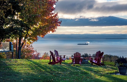 It offers 4 large bedrooms: one on the ground floor, two on the upper and a fourth on the lower level which also has a spacious family room equipped with a fireplace. You find two full bathroom and one powder room. Wifi, two fiber optic tv, bedding, towels, dishes and firewood are provided. An incomparably warm ambience in an environment of beauty and serenity awaits you. No trees, no construction (no neighbor's roof tops) or electric wires to obstruct this dazzling view on the St Lawrence River.