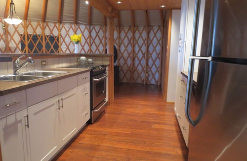 The Yurt sleeps up to six guests, with a king-sized bed in the master bedroom, two twins in the loft and a pull out couch in the living room. All linens and towels are included. There is wrap around deck with a BBQ and outdoor seating. Our outdoor fire pit is great for roasting marshmallows, sharing campfire stories and relaxing under the stars.