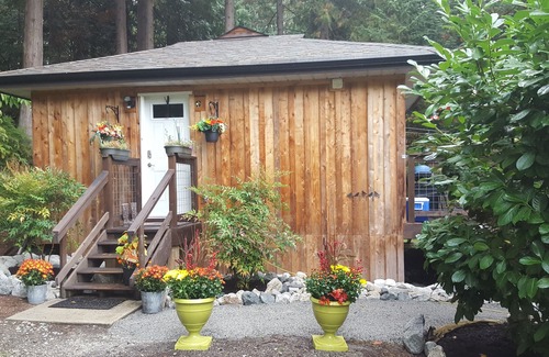 Newly renovated charming 1 bedroom cottage is sure to please. Nestled among the trees and surrounded by nature offering both ocean a pond views from your own private deck in Roberts Creek on the beautiful Sunshine Coast!The cottage offers 1 king size bed in the very large bedroom with desk for working space.The sofa pulls out to a double bed. The cottage has a washer and dryer, stove ,oven , fridge and bathroom with nice sized shower. A private deck overlooking ocean and pond views .Enjoy a peaceful and relaxing getaway nestled in a quiet ocean view setting in Roberts Creek. Enjoy the views of the large ponds while listening to the tranquil white noise of the waterfall. The property has many regular "visitors" of ducks, heron's, deer and bears as well.A little piece of paradise yet just minutes from downtown Gibson's.