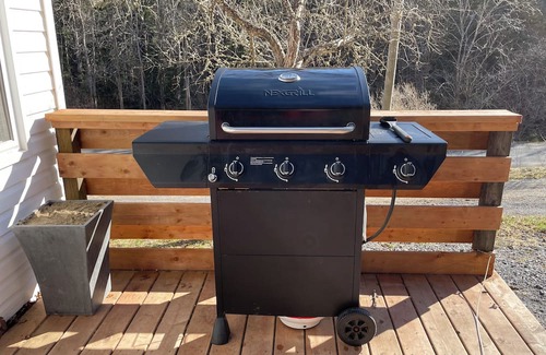 You’ll find two double beds with memory foam toppers, plenty of storage, a fully equipped kitchen, and a comfy living area with a wood stove and Smart TV (Netflix provided). The deck overlooks a peaceful creek and forest, perfect for your morning coffee or evening soak in the hot tub.
