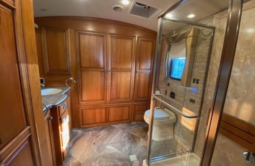 Inside find living area that seats 6 comfortably, loveseat with hide-a-bed, 4 TVs incl 48 inch on televator in living area, table (adjustable) and chairs in kitchen, induction stove top, microwave, dishwasher, household refrigerator, large pantry with slide out shelves, half bath mid-ship, bedroom with king bed, plenty of drawers and hanging space, bedside tables, huge ensuite with extra large shower with seat, toilet, double sinks, stacked washer/dryer, extremely large closet. Comes equipped with all kitchen equipment: plates, cutlery, pots and pans, coffee maker, blender, air fryer, toaster and more. Linens provided (sheets, comforter, blankets, pillows and towels/facecloths for 4).