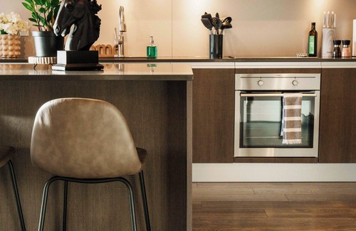 -Indoor island with stools for eating
