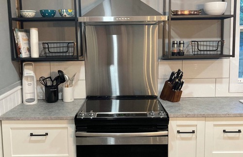 The recently renovated cottage has all the comforts of home. With a primary suite on the main floor and a second one upstairs there is ample room for two families. The bonus/loft space has two single beds but the doorway to the room is 4 foot tall so best suited to smaller guests. The large kitchen is fully stocked with everything you need including an air fryer, toaster oven and microwave. The farmhouse table seats 10 or you can enjoy meals on the covered porch and watch the humming birds feed.