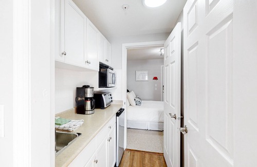 The views continue in the stylish living area of the adjoining condo, fitted with a sofabed and flatscreen TV. A convenient kitchenette is equipped with a mini-fridge, sink, toaster, coffeemaker, and microwave. Play games or enjoy a snack at the two-person bistro table. Added perks include a jetted bathtub and a TV in the bedroom.