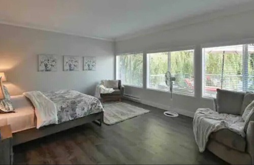 The back deck has a natural gas BBQ, hot-tub, outdoor dining table and a comfortable seating area with a propane fire pit. Our property is completely fenced and there is a gate to the stairs that leads to the beach. Our house is a waterfront property not a beachfront property (meaning there is no sandy beach for guests to use) The beach is only accessible on lower tide and it can be mucky and rocky and not a recommended swimming area. There is public beach access next to our property as well that leads to a larger beach area.