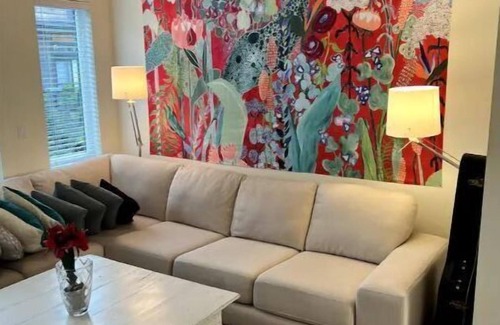 This modern 1,010-square-foot townhouse offers two bedrooms upstairs—one with a king bed and the other with a queen. The living room features a sectional sofa that converts into a queen-size hide-a-bed, providing flexible sleeping arrangements for additional guests.